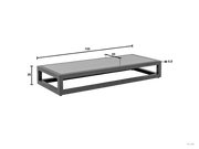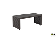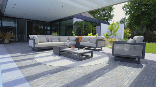 De arm- en rugkussens buigen zich iets over de leuningen, wat een zachte touch toevoegt aan de strakke lijnen. Bij de set horen twee aluminium koffietafels: een grote met een HPMS Stone blad en een kleinere met mooie lamellen, die speels over de grote tafel heen schuift.