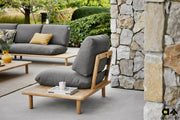 Deze teakhouten Sling module set ademt een relaxte sfeer. Dit dankt hij aan de unieke vormgeving van de kussens en de banden die de kussens dragen, en aan de royale afmetingen van de modules. Een leuk detail is de knoop in het teakframe waarmee het rugkussen stevig op zijn plaats wordt gehouden.
