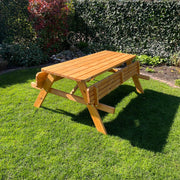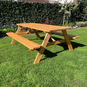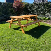 Unser 200 cm langer, imprägnierter DeLuxe-Picknicktisch ist etwas länger als unsere Standardversion (200 cm). Dadurch eignet er sich ideal, wenn Sie etwas mehr Platz benötigen. Dieser Tisch ähnelt unserem DeLuxe-Picknicktisch. Der Unterschied liegt in der attraktiven Douglasienfarbe.