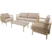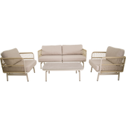 Loungeset Akiro is een complete buitenset die stijl en comfort naar jouw terras, balkon of tuin brengt. Met een moderne, mat beige afwerking en onderhoudsvriendelijke materialen biedt deze set een uitnodigende plek om te ontspannen met vrienden en familie.