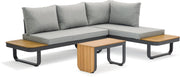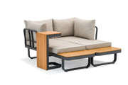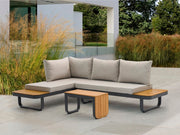 De Samos loungeset heeft een stevig aluminium frame en tafelbladen van natuurlijk acaciahout. De kussens zijn gemaakt van zacht spun polyester in een stijlvolle taupekleur. Deze combinatie van hoogwaardige materialen maakt de set onderhoudsvriendelijk en bestand tegen verschillende weersomstandigheden, zodat je er langdurig plezier van hebt.