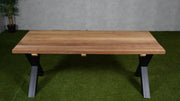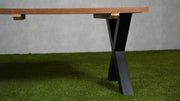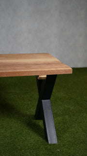 Het robuuste blad wordt gecombineerd met moderne stalen X-poten, afgewerkt met een zwarte poedercoating. Deze coating zorgt niet alleen voor een strakke, industriële look, maar biedt ook extra bescherming tegen roest en slijtage.