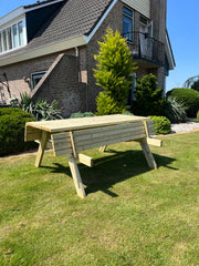 Door onze jarenlange ervaring met picknicktafels zijn onze picknicktafels volledig geoptimaliseerd en hebben we een tafel die super netjes, gebruiksvriendelijk, duurzaam en goedkoop is. Deze picknicktafel is gemaakt van onder druk Geïmpregneerd Europees Grenenhout, wat jarenlang meegaat in zon, regen, wind en storm; kortom weerbestendig! Hierdoor is de tafel perfect voor buitengebruik en comfortabel om te zitten in de heerlijke voorjaars- en zomermaanden.