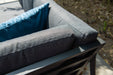 De set bestaat uit een hoekelement met twee loungebanken, een lounge dining tafel en een sportbankje.