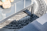 Das Esmee Lounge-Set wird komplett montiert geliefert, mit Ausnahme der Glasplatte auf dem Lounge-Tisch. Dank Saugnäpfen bleibt die Glasplatte fest an Ort und Stelle. Beinkappen sorgen für einen sauberen Abschluss, während eine Verbindungsklemme die beiden Sofateile sicher verbindet.