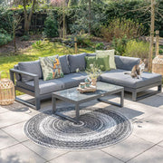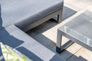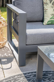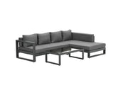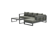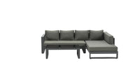 Das Esmee-Lounge-Set ist für maximalen Komfort konzipiert und besteht aus einem geräumigen Dreisitzer-Loungesofa und einem Chaiselongue-Bereich. Der wartungsfreie Aluminiumrahmen sorgt für Langlebigkeit und einfache Wartung. Der Loungetisch verfügt über eine Platte aus gehärtetem Glas für ein elegantes Erscheinungsbild.